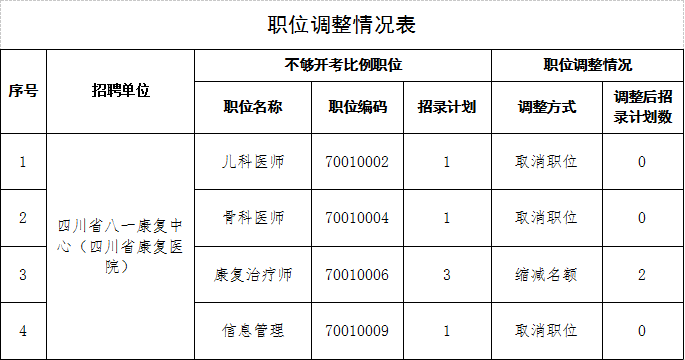 因無人報考或報考人數未達到規定的開考比例,經研究,取消四川省八一康復中心(四川省康復醫院)兒科醫師等3個招聘職位(3個招聘名額),調減該單位康復治療師招聘職位1個招聘名額。詳細情況見下表。